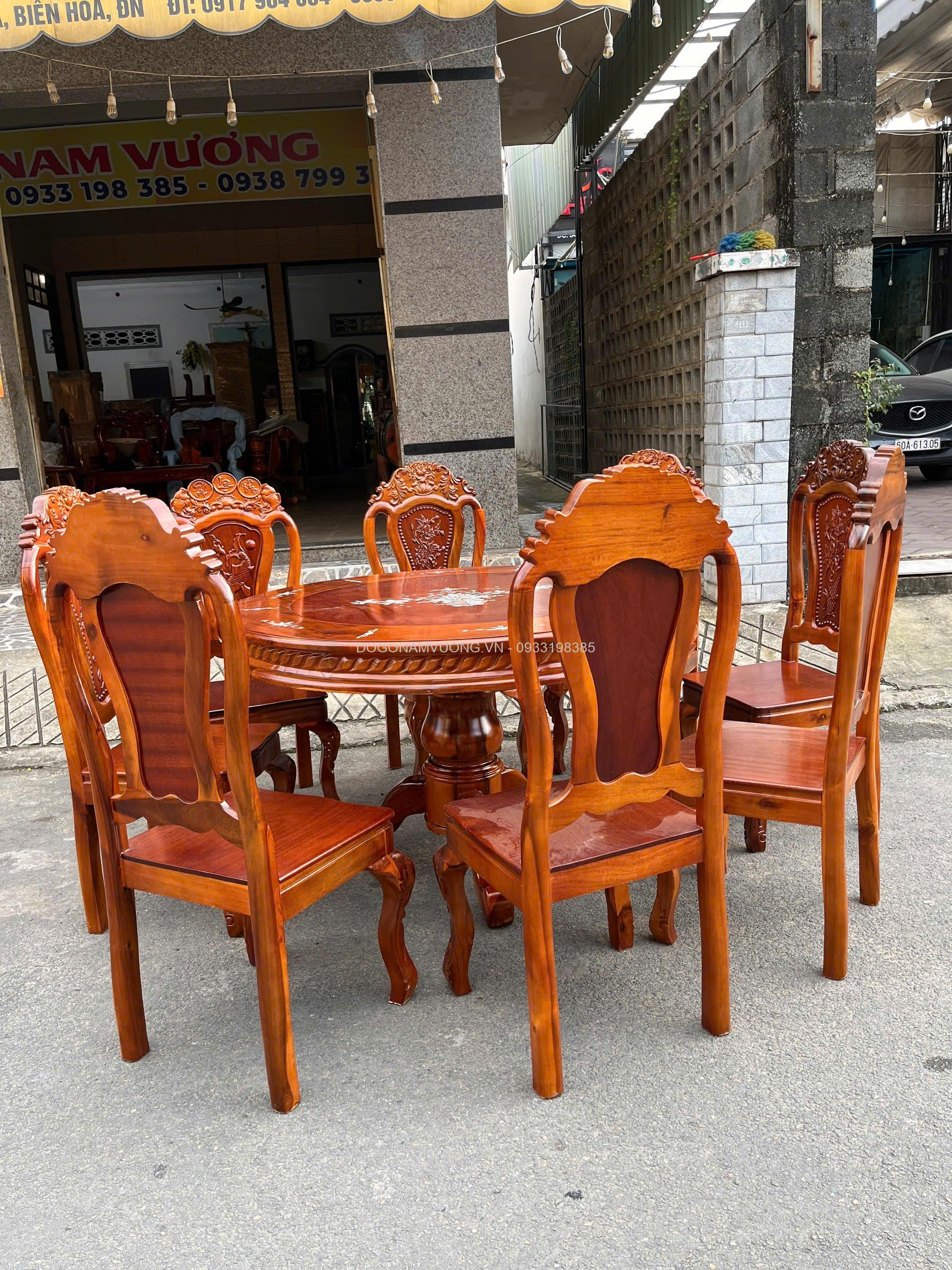 Bộ bàn ăn gỗ tram bông vàng mặt xoan đào với kích thước đường kính bàn 1m25 và 8 ghế thích hơp cho phòng ăn nhỏ