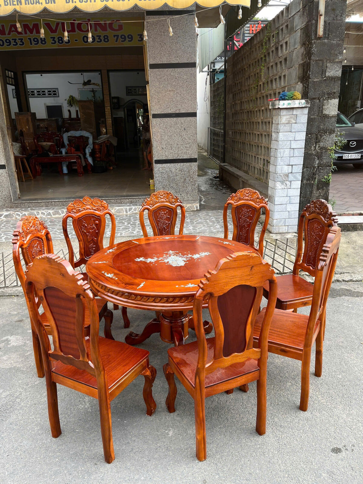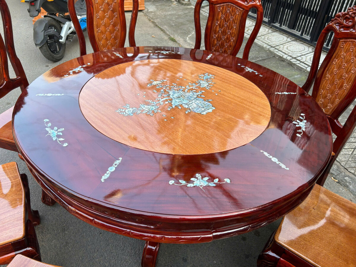 Bộ bàn ăn gỗ tram bông vàng mặt xoan đào với kích thước đường kính bàn 1m25 và 8 ghế thích hơp cho phòng ăn nhỏ